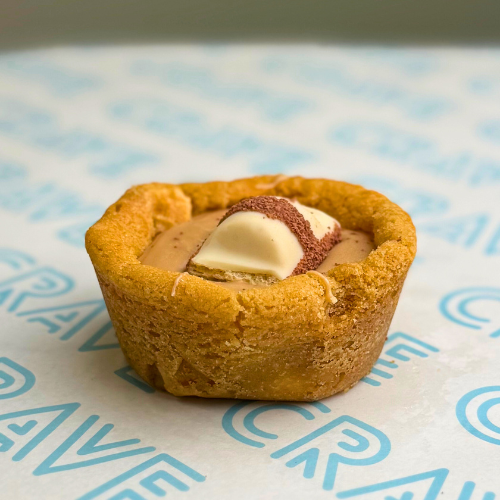 White chocolate cookie cups filled with a white chocolate hazelnut ganache and topped with chunk of Kinder Bueno Chocolate.